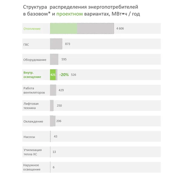 Внутреннее освещение – второй по значимости источник в энергопотреблении объекта.