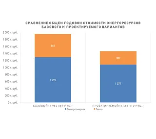 Результаты энергомоделирования Основная экономия средств на энергетические ресурсы была достигнута благодаря более эффективному использованию тепловых ресурсов. Далее рассмотрим решения, которые помогли достичь такой экономии.