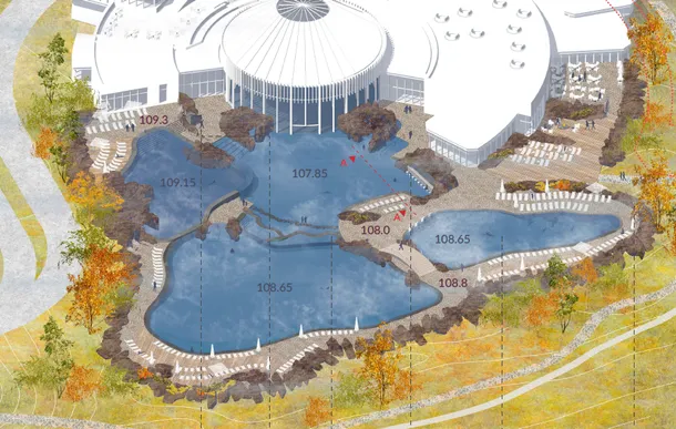 На объекте предусмотрены системы снеготаяния пешеходных дорожек променада, а также обходных дорожек наружных бассейнов. Системы присоединяются к тепловым сетям по независимой схеме с установкой 2-х пластинчатых разборных теплообменников. Греющим контуром в данных системах является термальная вода, теплоноситель – вода с пропиленгликолем 40%. Трубопроводы системы снеготаяния прокладываются в бетонном слое дорожного покрытия променада и бассейнов. Способ, глубина раскладки и шаг трубопроводов обеспечивают оптимальное распределение тепла на наружной поверхности. Решение позволяет решать проблему обледенения дорожек, повышает комфорт для пользователей и является энергосберегающим.