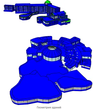Снижение теплопоступлений от солнца На изображении показаны солнечные теплопоступления Базовой и Проектной моделей оздоровительного комплекса на дату 15 июля в полдень. Они отличаются – в Проектной модели в помещения попадает меньше солнечной радиации, поскольку коэффициент пропускания солнечной энергии проектируемого здания более чем в 2 раза ниже базового значения. Это приводит к сокращению потребности в охлаждении помещений.
