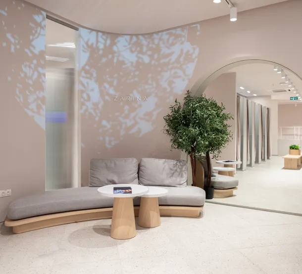 Магазин «Zarina», расположенный в ТРЦ «Галерея» в Санкт-Петербурге, стал первым объектом, прошедшим сертификацию по стандарту GREEN ZOOM Среда. Магазин сочетает в себе все 3 принципа устойчивого развития: экономическую целесообразность, заботу об экологии и человеке. Для того, чтобы разобраться, как удалось создать устойчивую среду в рамках одного магазина на территории торгового центра, необходимо присмотреться к деталям. С первого взгляда можно отметить просторный торговый зал, создающий ощущение спокойствия. Такой эффект достигнут за счет использования в интерьере светлых природных оттенков, фактур, которые не режут глаз, и широких проходов, обеспечивающих свободу передвижения и хороший обзор. Связь с природой отражается не только в цветовых сочетаниях, но и благодаря использованию естественных текстур дерева и камня в элементах мебели, отделке и округлым формам без острых углов, а также проекции изображения кроны дерева в зоне примерочных. Для посетителей предусмотрены зоны отдыха с мягкими диванами и креслами, в примерочных также подумали о человеке - есть полочки для телефона, а форма штанг для шторок спроектирована так, чтобы обеспечить полную приватность.