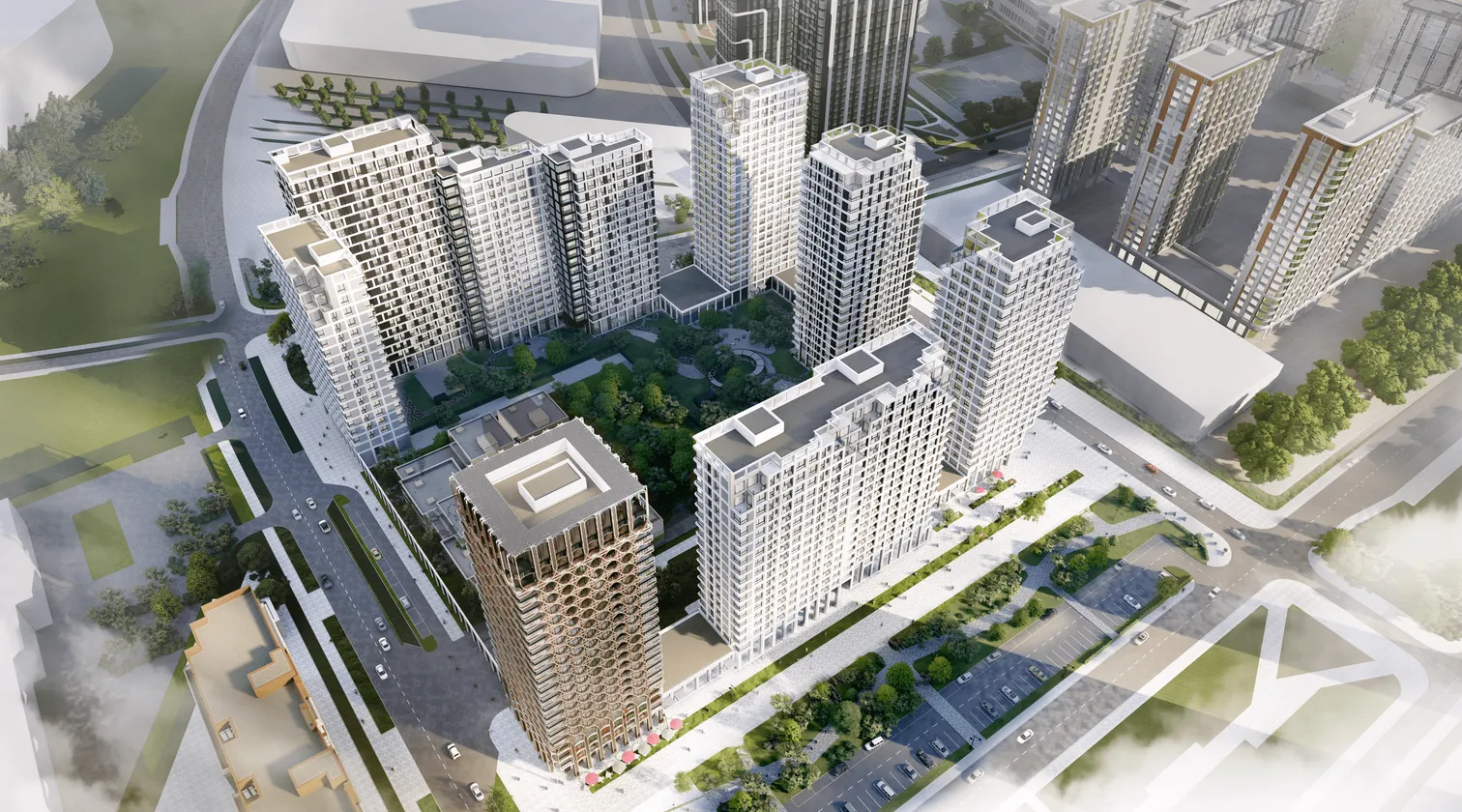 Ландшафтная концепция основана в гармонии с окружающей природой. На территории предусмотрено несколько прогулочных маршрутов, пространства для игр, спортивные площадки для разных возрастов, места для уединенного отдыха. Для озеленения территории подбирались преимущественно адаптивные к местному климату растения. Для повышения водоэффективности была разработана система сбора дождевой воды для возможности организации требуемого дополнительного полива в засушливое время года. Также вдоль одного из маршрутов на территории было предусмотрено обустройство дождевого сада с высаженными влаголюбивыми растениями.