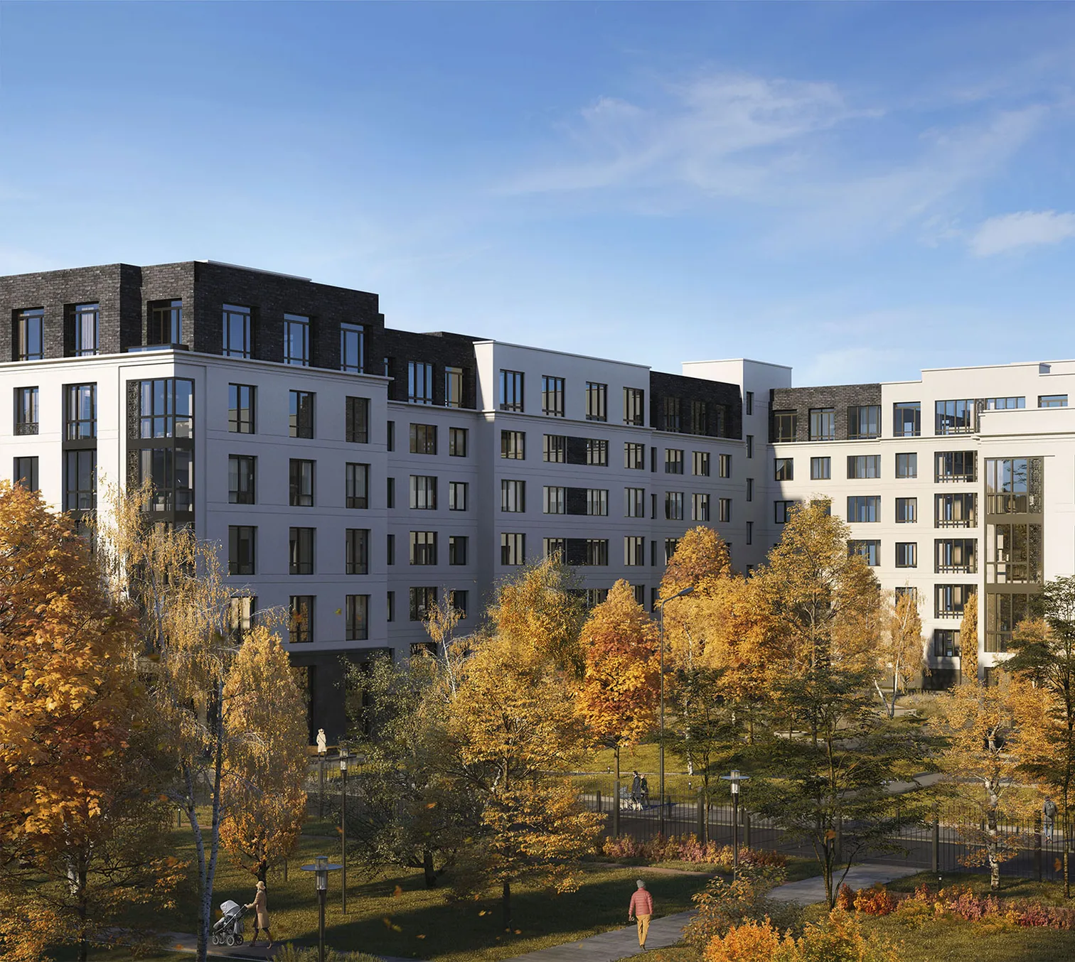 Жилой комплекс состоит из четырех корпусов высотой от четырех до шести этажей. Четыре здания образуют уютный малоэтажный квартал в неоклассическом дизайне, который распахивается в сторону городского парка.