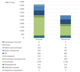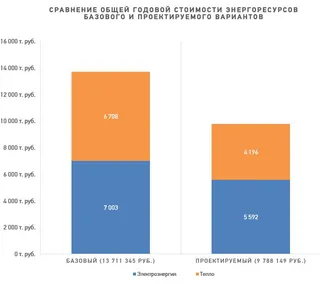 Результаты энергомоделирования Основная экономия средств на энергетические ресурсы была достигнута благодаря более эффективному использованию тепловых ресурсов. Далее рассмотрим решения, которые помогли достичь такой экономии.