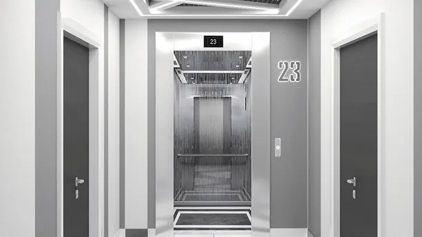 Бесшумность лифтового оборудования KONE обеспечивается с помощью плавного хода и отсутствия вибрации. В каждой секции установлено по 2 грузопассажирских лифта вместимостью 13 человек. Скорость 2 м/с позволяет комфортно распределить пассажиропоток в доме, так что время ожидания лифта не превышает 90 секунд.