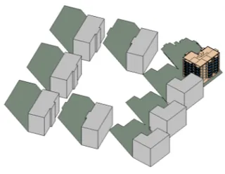 Для моделирования потоков энергии во всем объекте учитываются теплотехнические свойства ограждающих конструкций, внутренние нагрузки от оборудования и людей, а также наружное воздействие солнечной инсоляции. Для оценки солнечной инсоляции выполнен расчёт затенения окружающими объектами с учётом географического положения объекта, его ориентации в пространстве, месяца, времени суток.