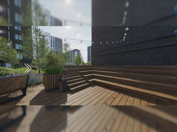 На ступенях амфитеатра можно проводить импровизированные концерты, здесь собираются на завтраки, отмечают праздники и смотрят кино. Также в беседке предусмотрены шезлонги и рабочая зона.