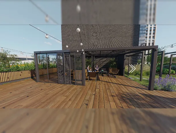 Одно из самых уютных и подходящих мест для отдыха на территории комплекса – это беседка, которая представляет собой многофункциональное пространство с деревянными настилами и навесами в зеленой зоне, с уютным уличным освещением и розетками.