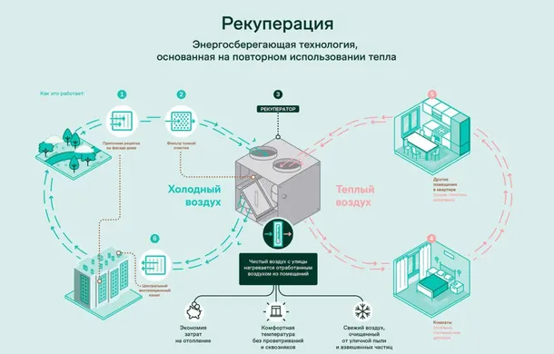 Система рекуперации тепла – это современная система вентиляции, которая круглый год обеспечивает приток свежего воздуха и вытяжку отработанного воздуха. При этом она удаляет все вредные вещества из квартиры, а свежий воздух – очищает. Помимо того, что система обеспечивает чистоту воздуха, 50% тепла она сохраняет в квартире. Таким образом, система рекуперации тепла делает воздух в квартире более качественным и позволяет экономить на отоплении.