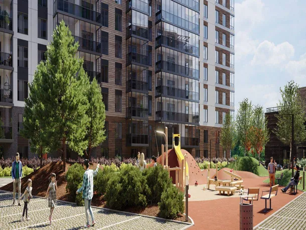 Природные аналогии и природные принципы были использованы в дизайне детских площадок: натуральные материалы (камень, дерево, песок), озеленение растениями, подобранными исходя из климатических особенностей, устройство холмов, с которыми можно взаимодействовать и использовать в игре, натуральные оттенки МАФ.