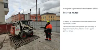 Пункт мытья колес У выезда со строительной площадки был организован пункт мытья колес. Техника, покидающая строительную площадку, не разносила грязь, песок и почву в другие районы города.