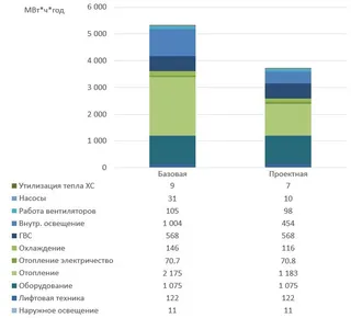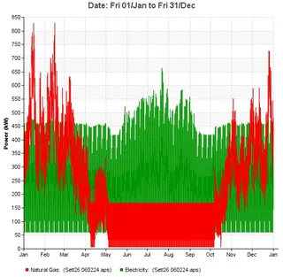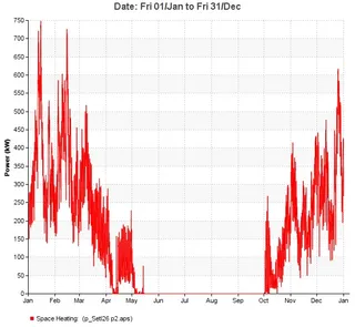 Потребление электричества и тепла Модель позволяет еще на стадии проектирования оценить годовые затраты объекта на тепловую и электрическую энергию. Для этого пригодятся данные из модели о тепло- и электропотреблении в течение года. На графике справа красная линия отображает потребление тепловой энергии. Зеленая линия – потребление электроэнергии.
