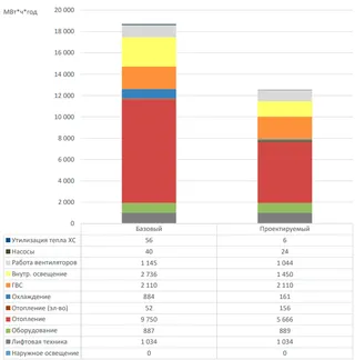 Годовое потребление энергии Анализ потребления энергии инженерными системами показал, что системы отопления и освещения являются самыми энергозатратными. Но благодаря улучшенным теплотехническим характеристикам ограждающих конструкций, автоматическому регулированию систем отопления, а также использованию энергоэффективных светильников с управлением по датчикам присутствия удалось сократить потребление энергии в 1,7 раз - на отопление и в 1,9 раз - на освещение.