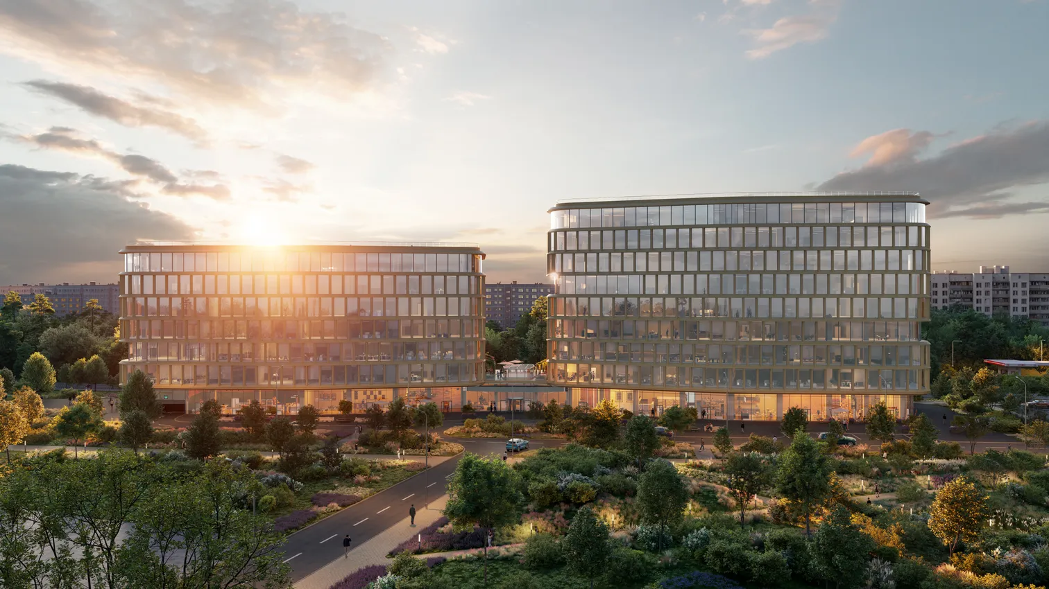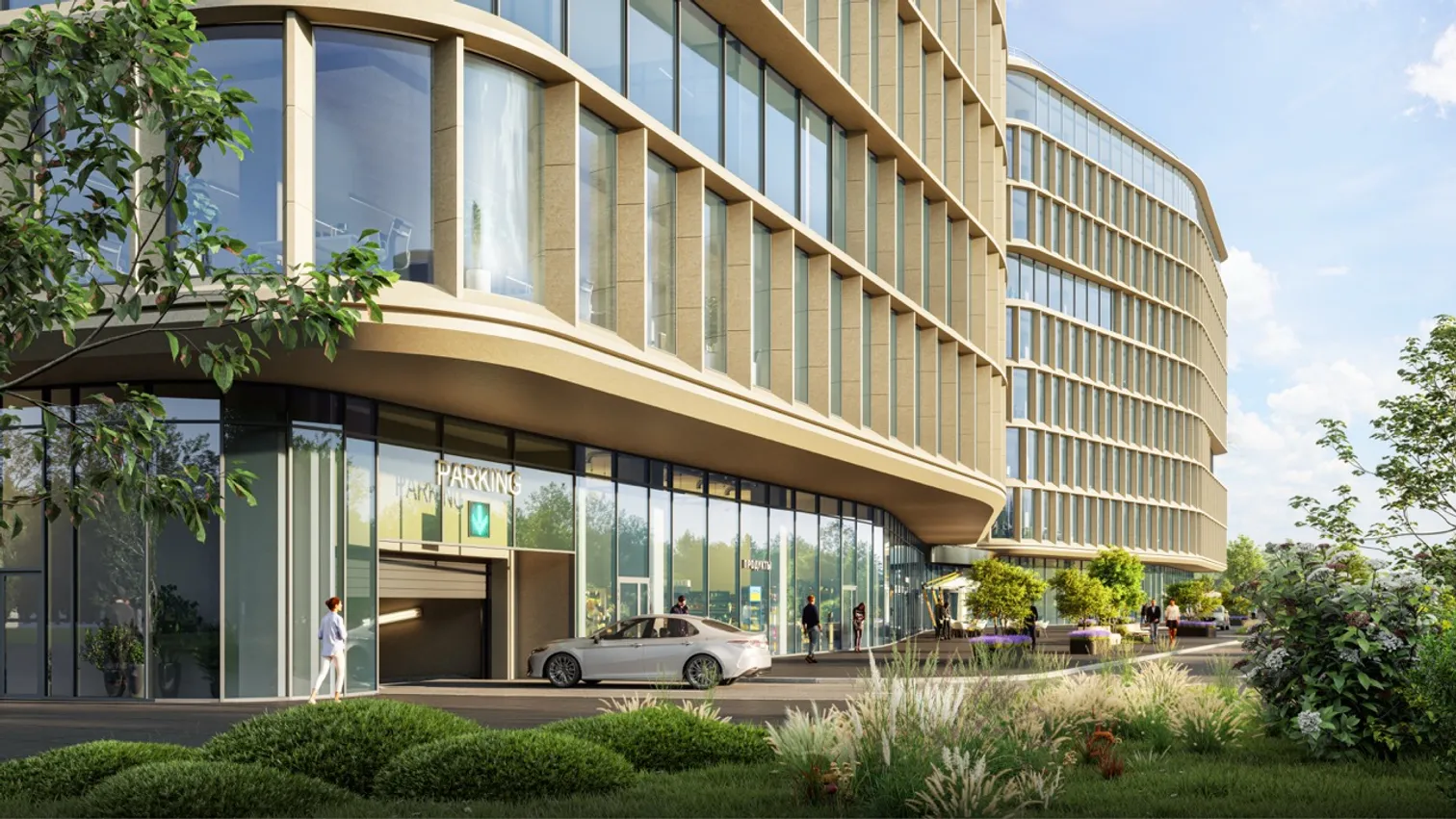 Бизнес-центр отличается элегантным архитектурным решением, в котором обтекаемые формы фасадов, выполненные из светлого фибробетона, сочетаются с масштабным использованием витражного остекления. Такой подход обеспечивает его гармоничную интеграцию в окружающую среду. Архитектурная концепция, основанная на принципах соразмерности и природоориентированности, позволяет зданию органично вписаться в ландшафт прилегающего природного парка.