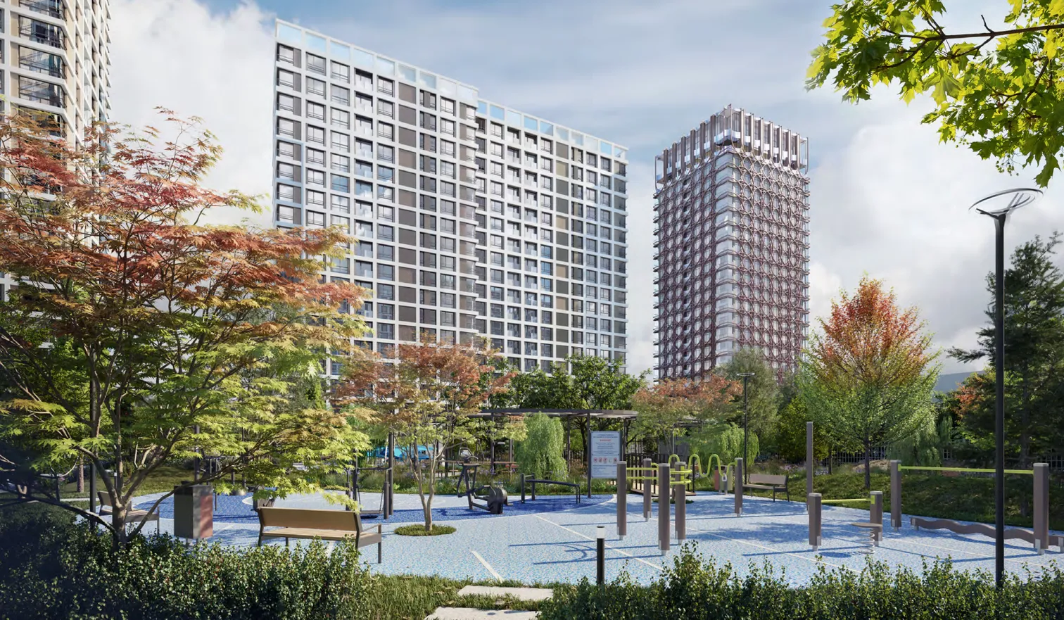 Ландшафтная концепция основана в гармонии с окружающей природой. На территории предусмотрено несколько прогулочных маршрутов, пространства для игр, спортивные площадки для разных возрастов, места для уединенного отдыха. Для озеленения территории подбирались преимущественно адаптивные к местному климату растения. Для повышения водоэффективности была разработана система сбора дождевой воды для возможности организации требуемого дополнительного полива в засушливое время года. Также вдоль одного из маршрутов на территории было предусмотрено обустройство дождевого сада с высаженными влаголюбивыми растениями.