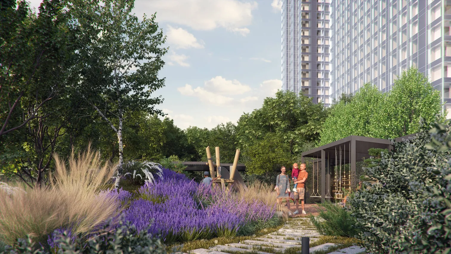 Концепция благоустройства предполагает создание участков с разнообразными активностями: дворовая территория предусматривает наличие рабочей зоны и сенсорного сада для спокойного отдыха. Многофункциональный и всесезонный ландшафтный парк, главной чертой которого является близость человека с природой, включает в себя зону с геопластикой, выполняющую роль защитной полосы от проезжей части, зелёный луг. Подобный контакт помогает обеспечивать удобство пребывания и отдыха на территории, положительные эмоции жильцов.